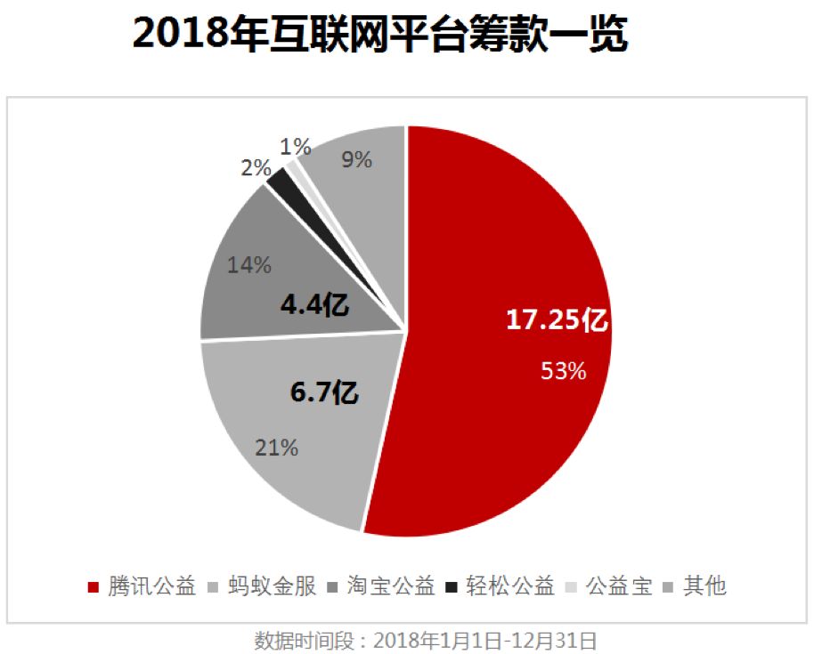 2018年,民政部指定的20家互联网募捐信息平台筹款总额超过31.7亿元。其中腾讯公益平台一家筹款17.25亿元,超过其他19家的总和。
